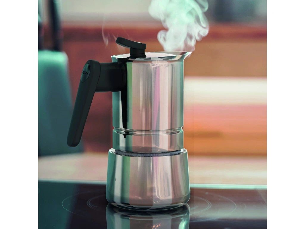 De Pedrini Steel Moka is een elegante en zeer duurzame mokkapot van roestvrij staal, geschikt voor alle warmtebronnen, inclusief inductiekookplaten . De pot is gemaakt van hoogwaardig roestvrij staal. RVS 18/10, wat zorgt voor een lange levensduur en optimale warmteverdeling. De handgreep is gemaakt van hittebestendig materiaal , bestand tegen temperaturen tot 210 °C, wat veilig gebruik mogelijk maakt, zelfs bij hoge temperaturen. De onderste container is voorzien van een hoogwaardig veiligheidsventiel voor een betrouwbare en veilige koffiebereiding.